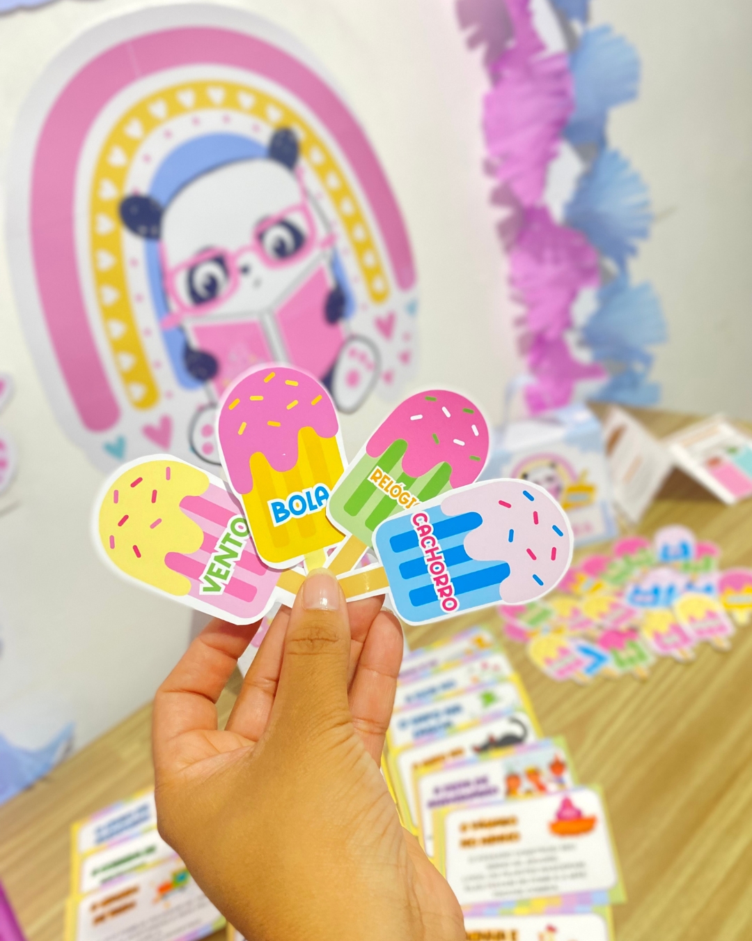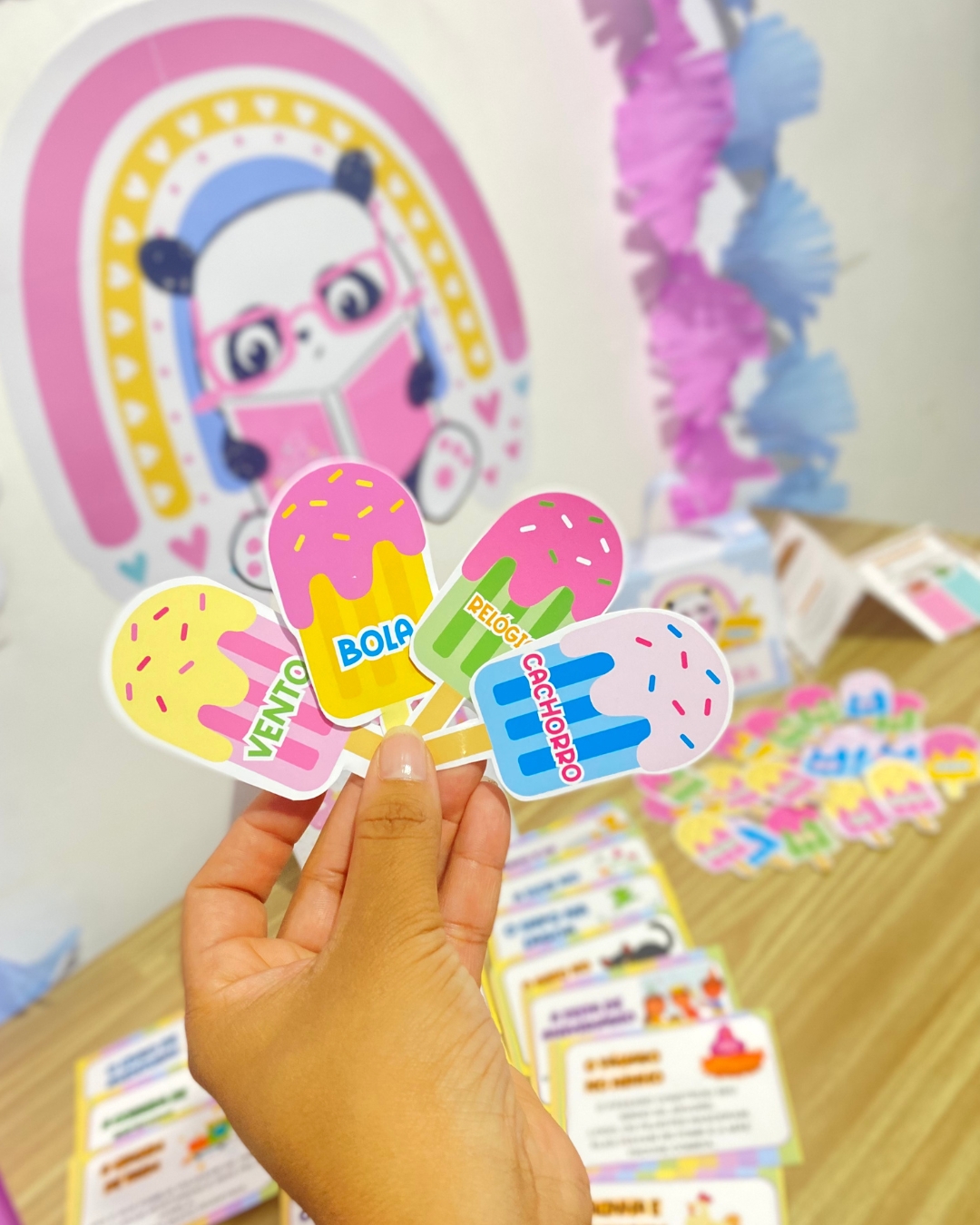 divertida! As crianças escolhem “picolés” com palavras para formar frases e histórias, estimulando a