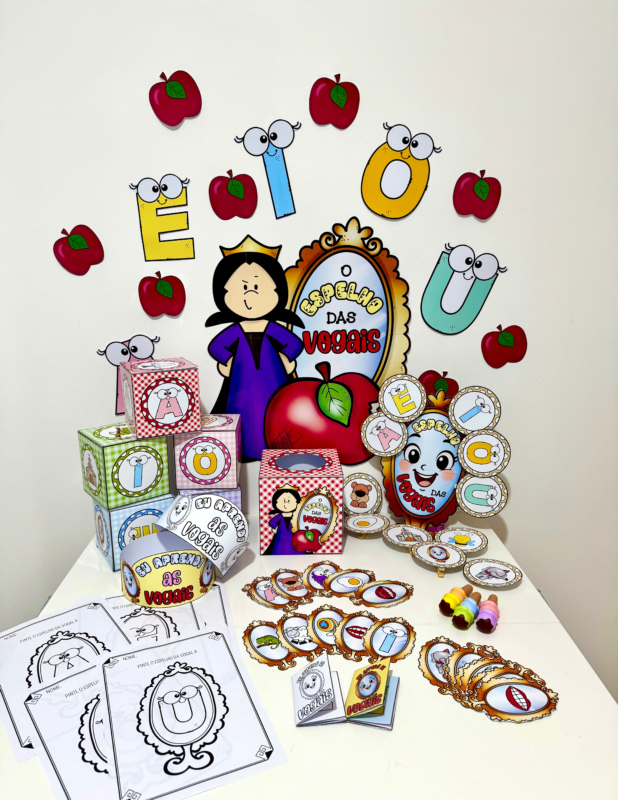 O Kit “O Espelho das Vogais” foi desenvolvido especialmente para turmas da Educação Infantil, unindo contação de histórias, atividades interativas e materiais visuais que facilitam o aprendizado de forma divertida e significativa.